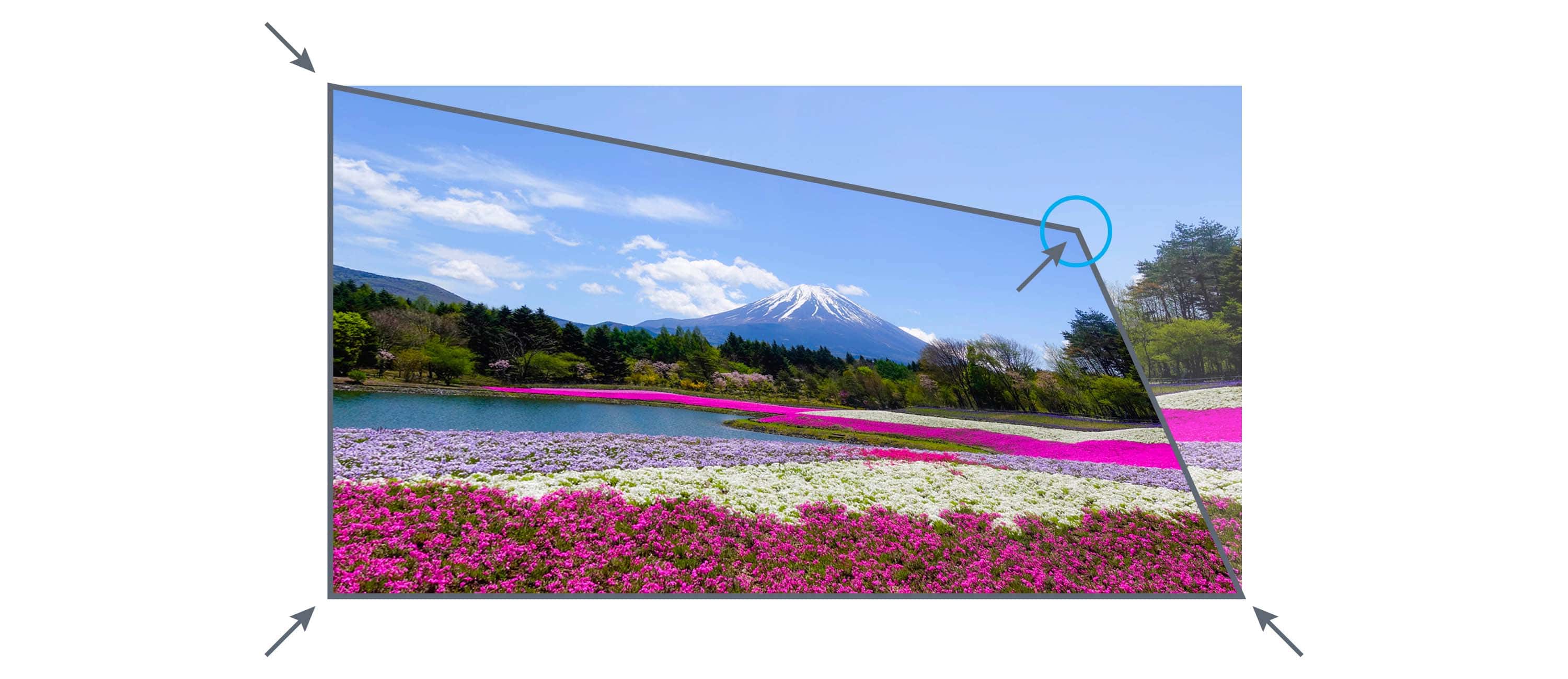 Korekcja czterech rogówDostosuj zniekształcenie trapezowe zarówno w płaszczyźnie pionowej, jak i poziomej. Możesz niezależnie przesunąć każdy róg obrazu, aby uzyskać obraz idealnie dopasowany do Twojej powierzchni. To wielkie ułatwienie w przypadku nierównych ścian lub tam, gdzie umieszczenie projektora jest niełatwe i musi on być zainstalowany pod kątem. |